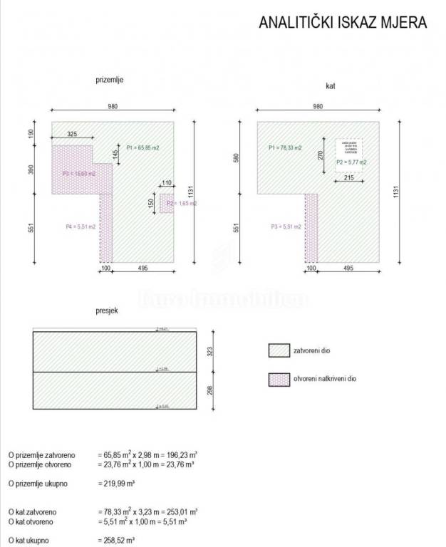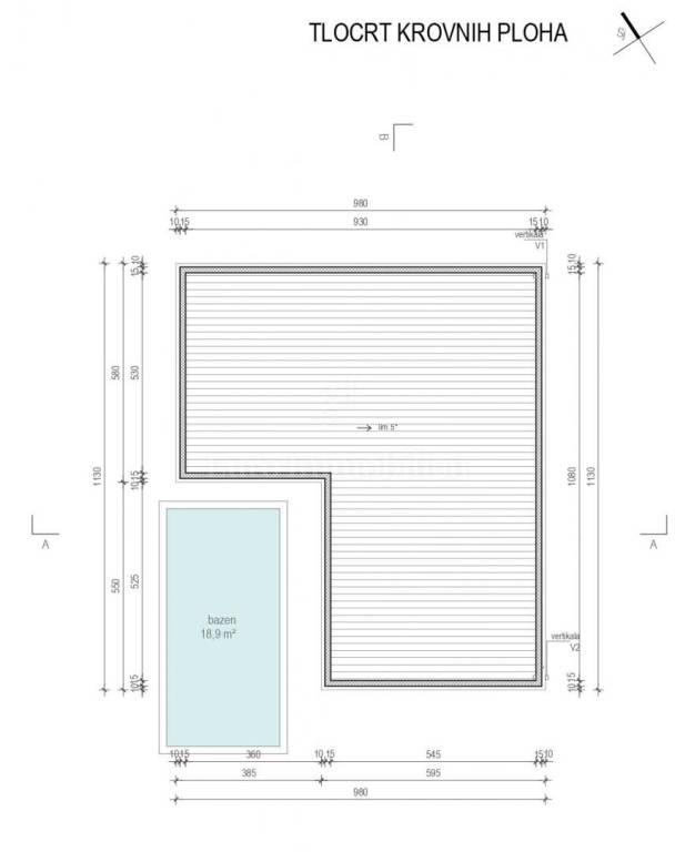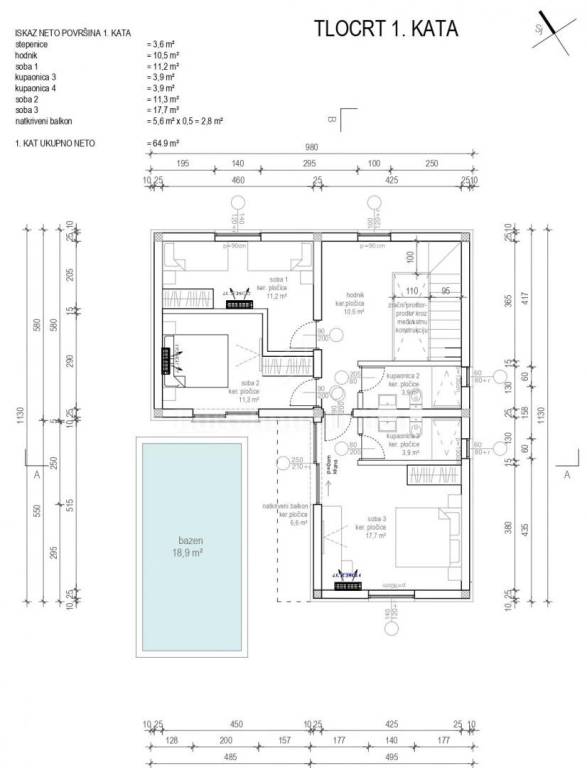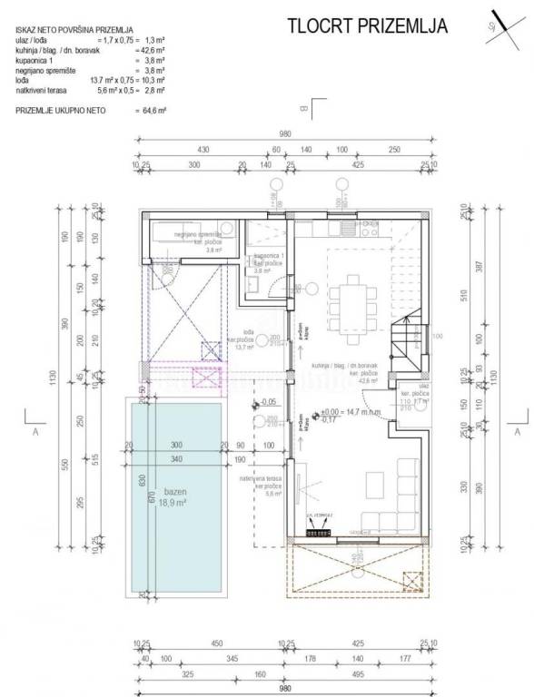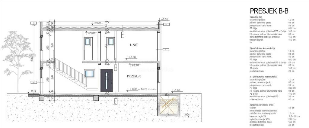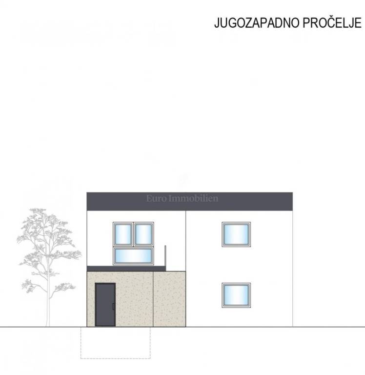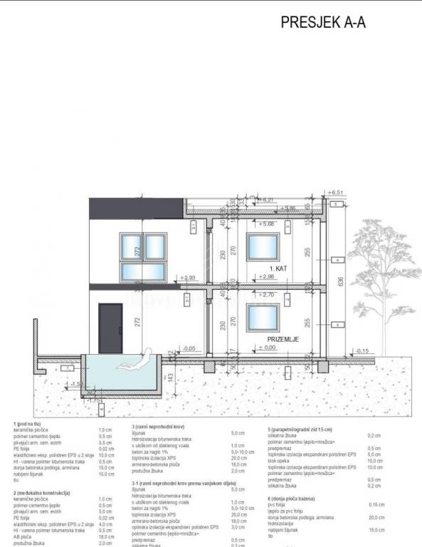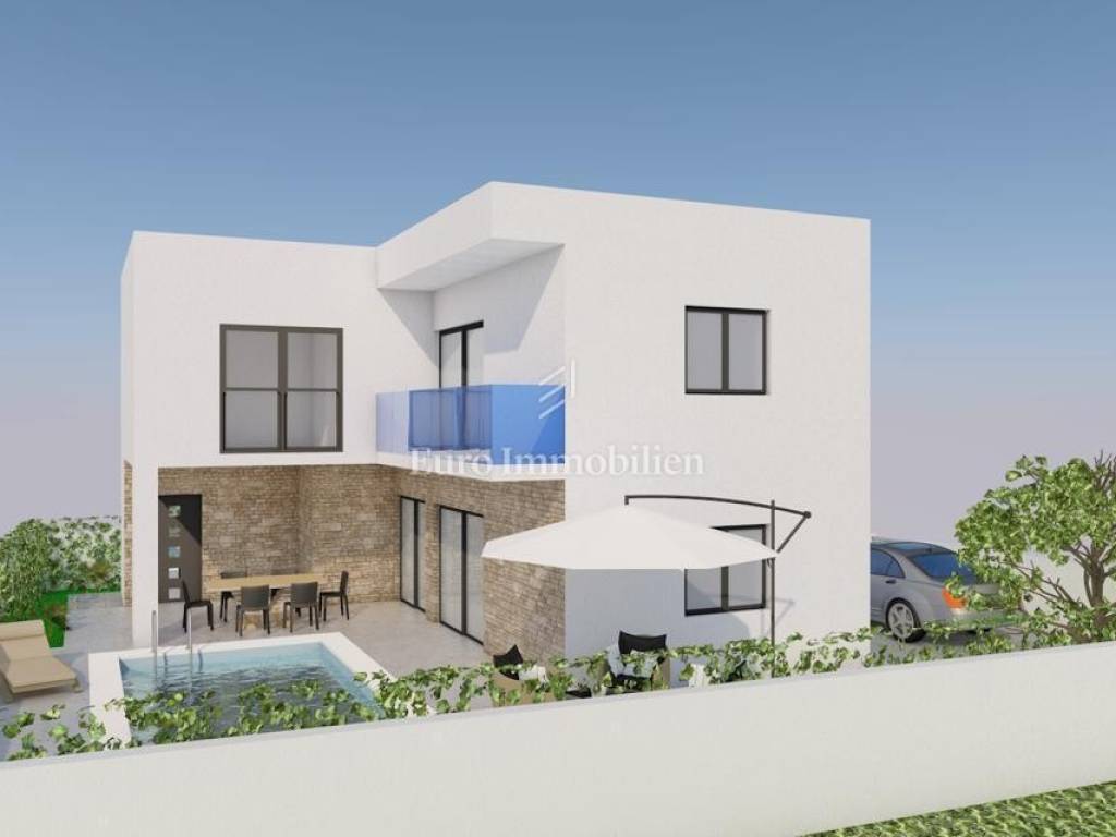Kuća se proteže na prizemlje i 1. kat. U prizemlju se nalaze spremište, loggia, kupaonica, natkrivena terasa, te kuhinja s blagovaonicom i dnevnim boravkom. Na katu se nalaze tri spavaće sobe, dvije kupaonice, hodnik i natkriveni balkon. Okućnica će biti lijepo uređena i obogaćena maslinama. Pročelje koje gleda na bazen u prizemlju će biti obloženo kamenom travertinom.