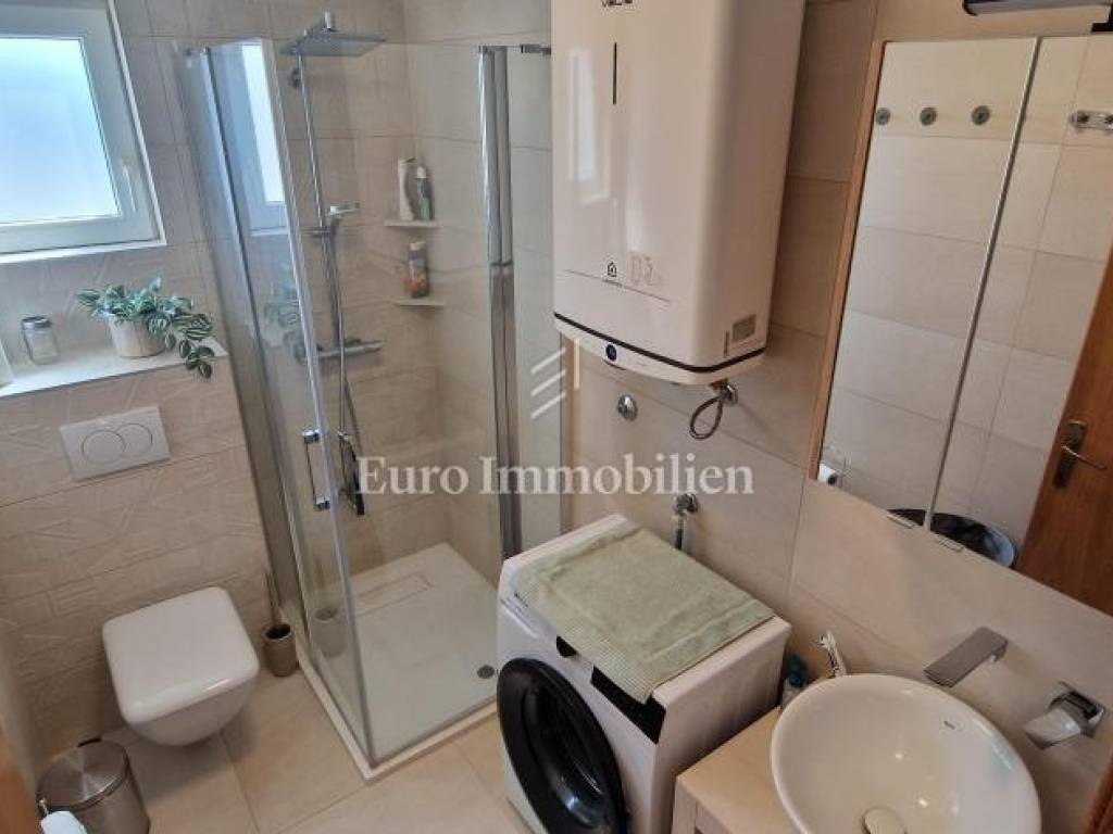 Stan površine 56,52 m2 se sastoji od hodnika, kupaonice, spavaće sobe, kuhinje s blagovaonicom i dnevnim boravkom, ostave, te dva balkona na sjevernoj i južnoj strani s prekrasnim pogledom na more. Dodatno spremište se nalazi unutar okućnice. Ima vlastito parkirno mjesto.