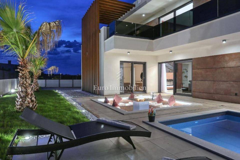 Prodaje se prekrasna moderna villa s bazenom na mirnoj lokaciji u Zatonu. Ukupna tlocrtna površina prizemlja i kata je 329,81 m2. Na prizemlju je ulaz, dnevni boravak s kuhinjom i blagovaonicom, spavaća soba s kupaonicom, WC, te praonica. Na katu je hodnik, tri spavaće sobe s vlastitim kupaonicama i izlazom na terasu. Ugrađen je kamin u dnevnom boravku, u spavaćim sobama i dnevnom boravku postavljeni su inverter klima uređaji, kupaonice su opremljene električnim podnim grijanjem, ugrađeni su PVC prozori, električne rolete i komarnici. Prodaje se kompletno namještena. Dvorište je uređeno, a u vrtu je postavljeno navodnjavanje. Uz samu villu nalazi se parking, vanjska kuhinja s kaminom, vanjski WC, te bazen površine 29 m2.