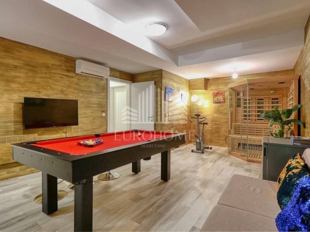 U podrumu se nalazi prostorija za zabavu i opuštanje sa saunom, sobnom biciklom i stolom za biljar, te kupaonom.