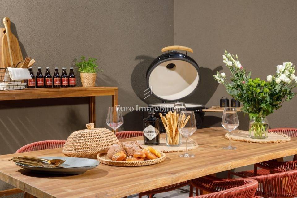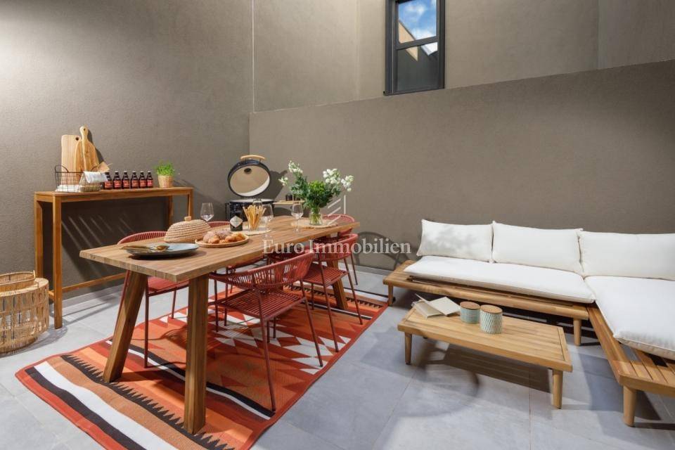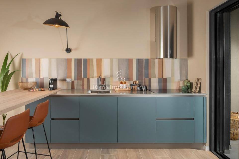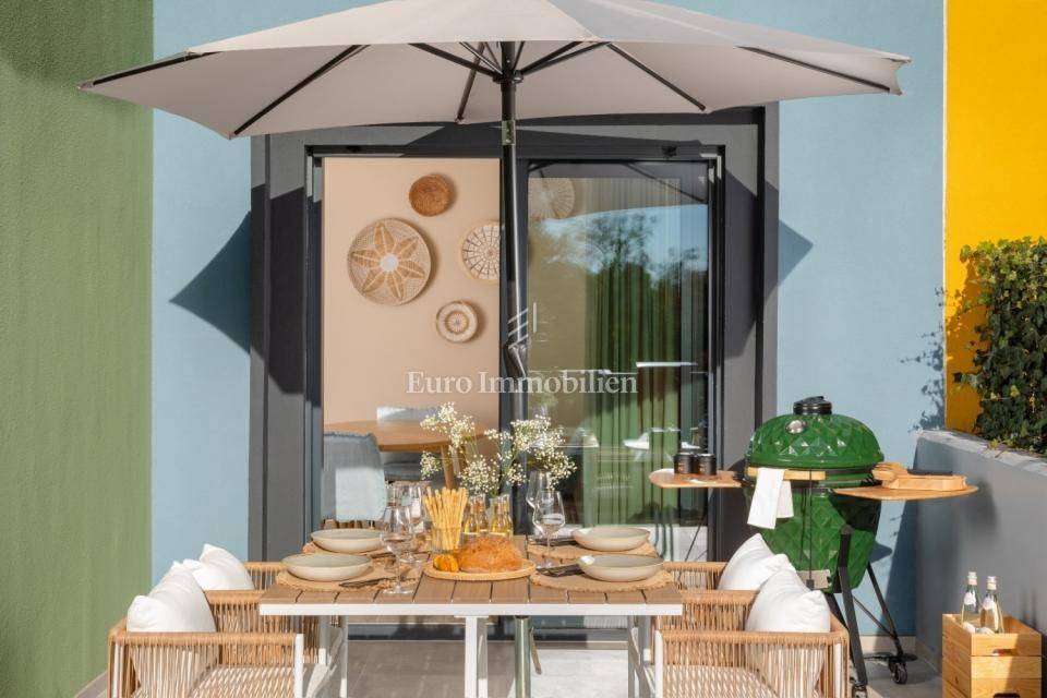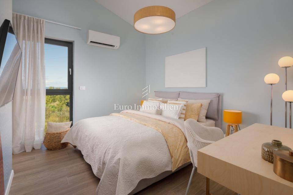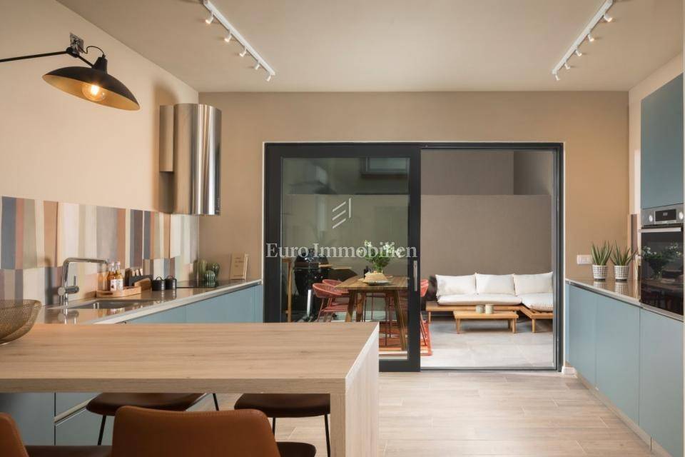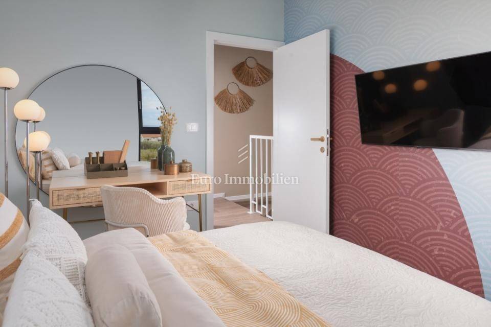 Poreč, Istra - na lijepoj i atraktivnoj lokaciji prodaje se kuća u nizu modernog dizajna, površine 76,27 m² na dvije etaže. U prizemlju je open space dnevni boravak s kuhinjom i blagovaonicom, spremište i wc za goste. Na katu su dvije spavaće sobe i kupaonica. Kuća ima predivan pogled more s terase, podno grijanje u cijeloj kući i klima uređaj u svim sobama i dnevnom boravku. Dva parkirna mjesta.