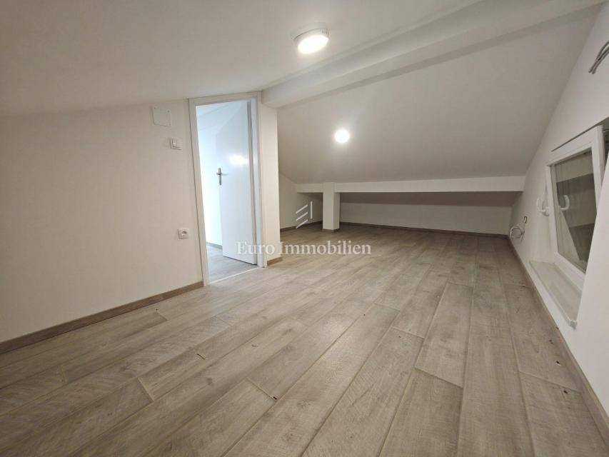 Stan se sastoji od WC-a, kupaonice, dvije spavaće sobe od koje jedna ima izlaz na prostranu terasu s panoramskim pogledom na more i izuzetno prostranog dnevnog boravka s kuhinjom i blagovaonicom open-space koncepta. Unutarnjim montažnim stepeništem dolazimo do tavanskog prostora veličine 25m2 koji je uređen te se može iskoristiti kao dvije dodatne dječje sobe s obzirom da je maksimalna stajaća visina 170cm.