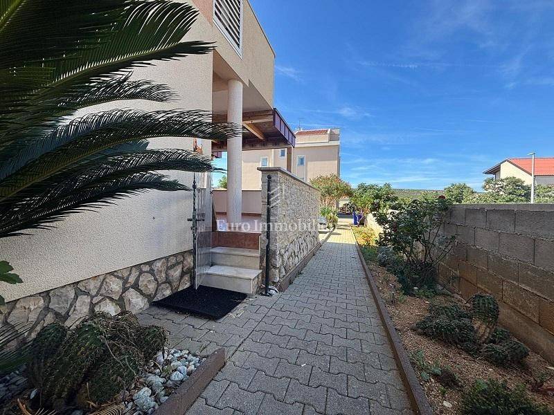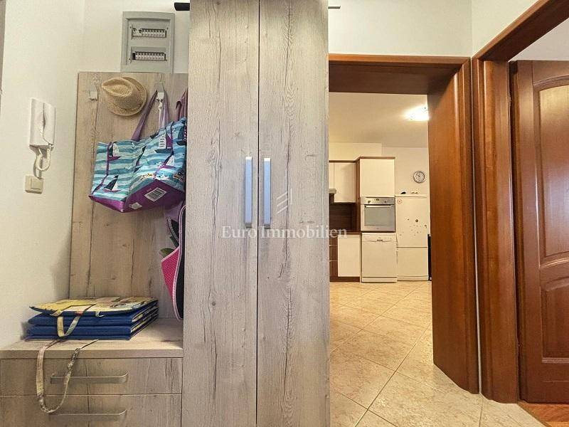 Na prodaju je stan površine 51,49 m² koji se sastoji od hodnika, dnevnog boravka s kuhinjom i blagovaonicom, 2 spavaće sobe, kupaonice s WC-om i ostave. Posebnu vrijednost daje velika natkrivena terasa od cca 19 m² s ljetnom kuhinjom, TV uređajem i tendama. Uz apartman dolaze i vrt te parkirno mjesto ukupne površine 47,61 m². Stan je klimatiziran i namješten. Lokacija je izvrsna – do pješčane plaže i šetnice uz more stiže se za samo 10-ak minuta hoda.