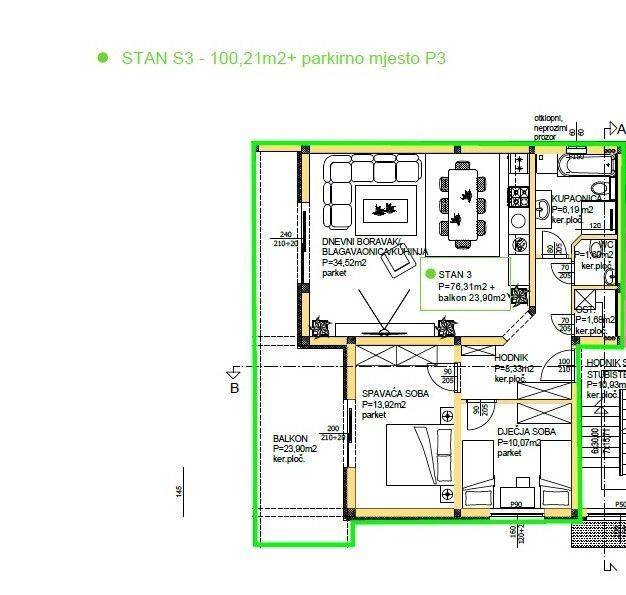 DNEVNI BORAVAK/ KUHINJA/ BLAGOVAONICA : 34,52 m2 HODNIK : 8,33 m2 DJEČJA SOBA : 10,07 m2 SPAVAĆA SOBA : 13,92 m2 KUPAONICA : 6,19 m2 WC: 1,60 m2 OSTAVA : 1,68 m2 BALKON : 23,90 m2U cijenu stana je uračunato i vanjsko nenatkriveno parkirno mjesto koje ima provedenu struju i vodu.