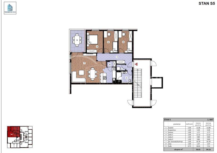 - Ukupna stvarna površina stana iznosi 96,65 m2, dok obračunska površina iznosi 94,15 m2.