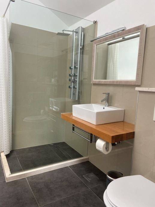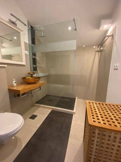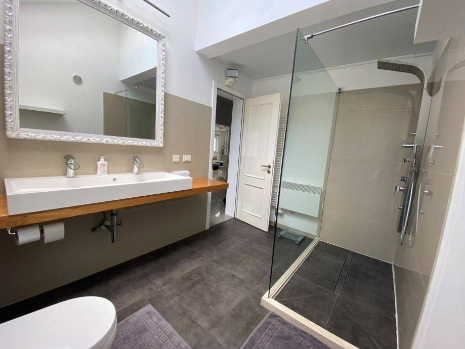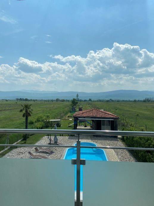 Kuća ima veliku okućnicu od 4000 m2, lijepo uređenu s bazenom, jacuzzijem, sunčalištem, dječjim parkom i odvojenom natkrivenom terasom.