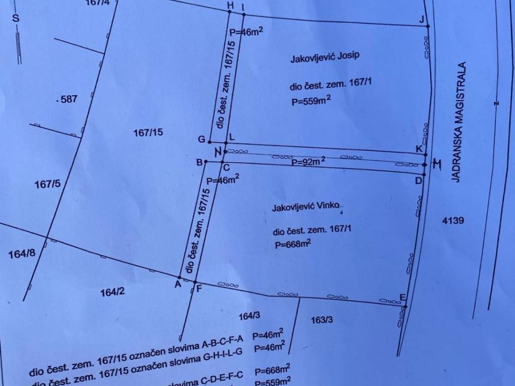 Ulaz na parcelu odmah s magistrale. Parcela je obrasla raslinjem i borovima.