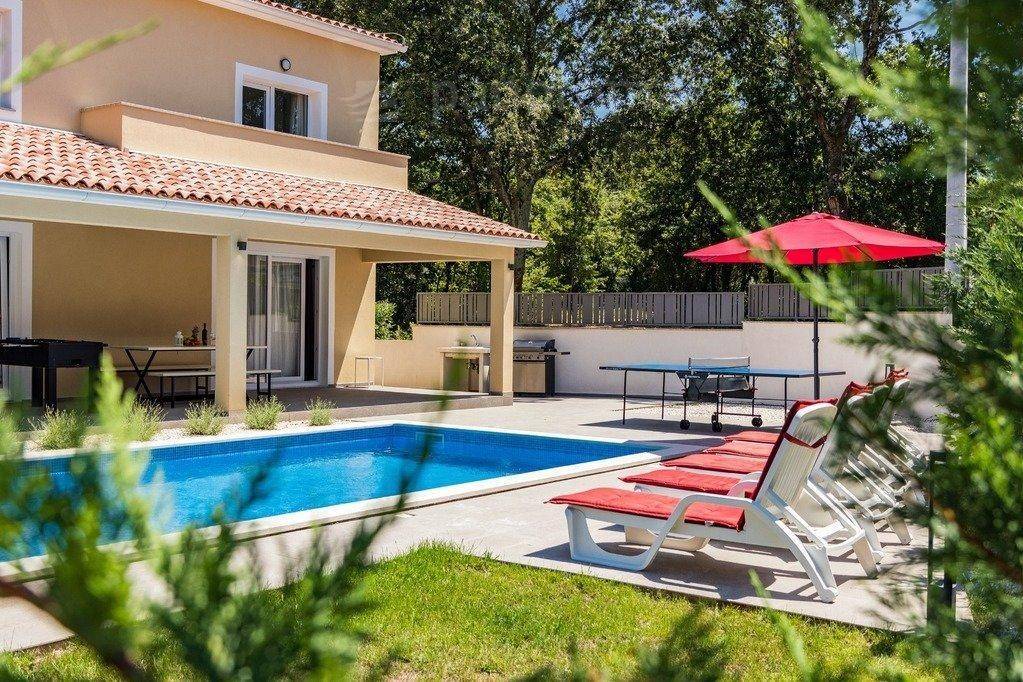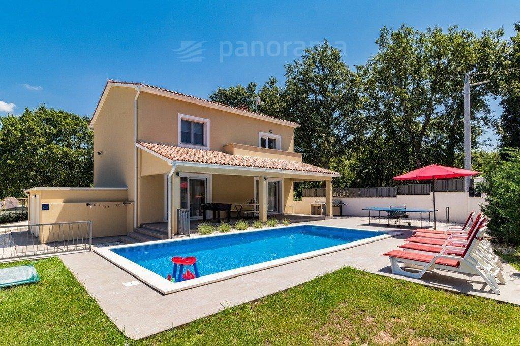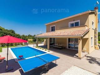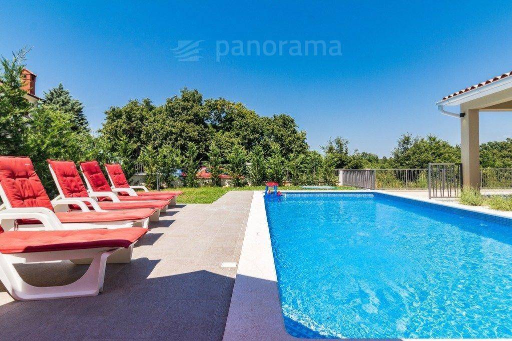 U nastavku natkrivene terase se nalazi sunčalište sa bazenom površine 36 m2. Parcela je ograđena, dijelom zazelenjena i s navodnjavanjem, dijelom popločana i s uređenim parkiralištem.