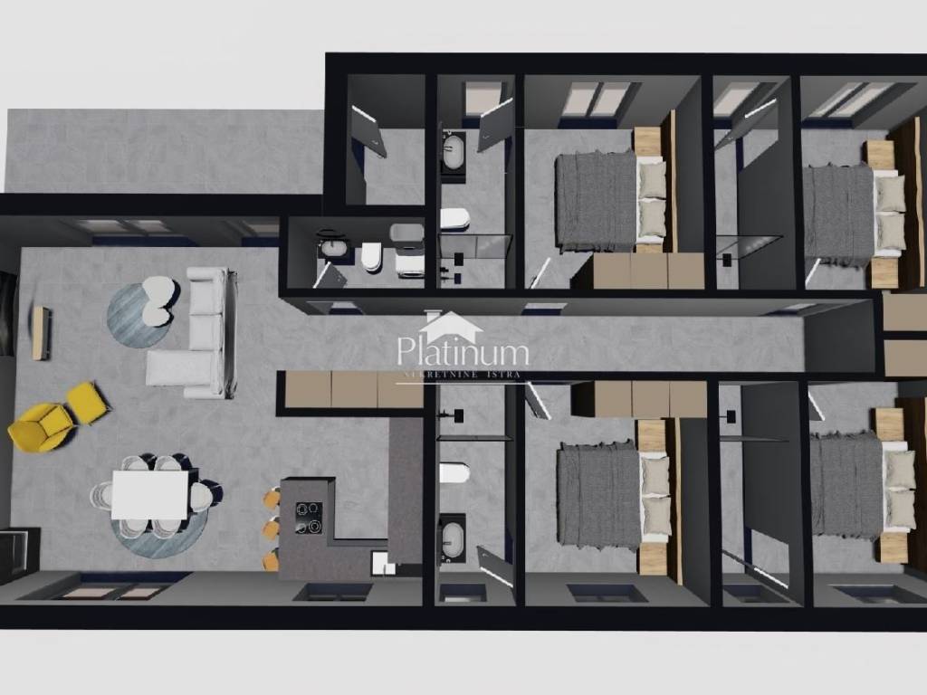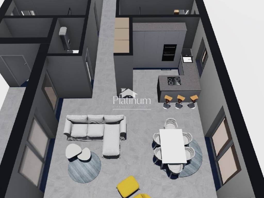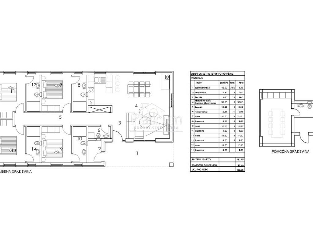 Sastoji se od dnevnog boravka,kuhinje s blagavaonom otvorenog tlocrta s pogledom na dvorište i prekrasan bazen.