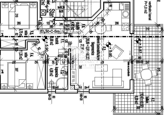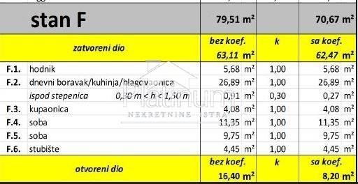 Oglašeni apartman na drugom katu netto površine je 70,67m2 + parkirno mjesto 3,13 m2. Stan se sastoji od hodnika (5,68 m2), , dnevnog boravka sa kuhinjom i blagovaonom (26,89 m2), kupaonce (4,08 m2), sobe (11,35 m2), sobe (9,75 m2) i terase (8,20 m2), prostor ispod stepenica (0,27m2) i stubište (4,45 m2).