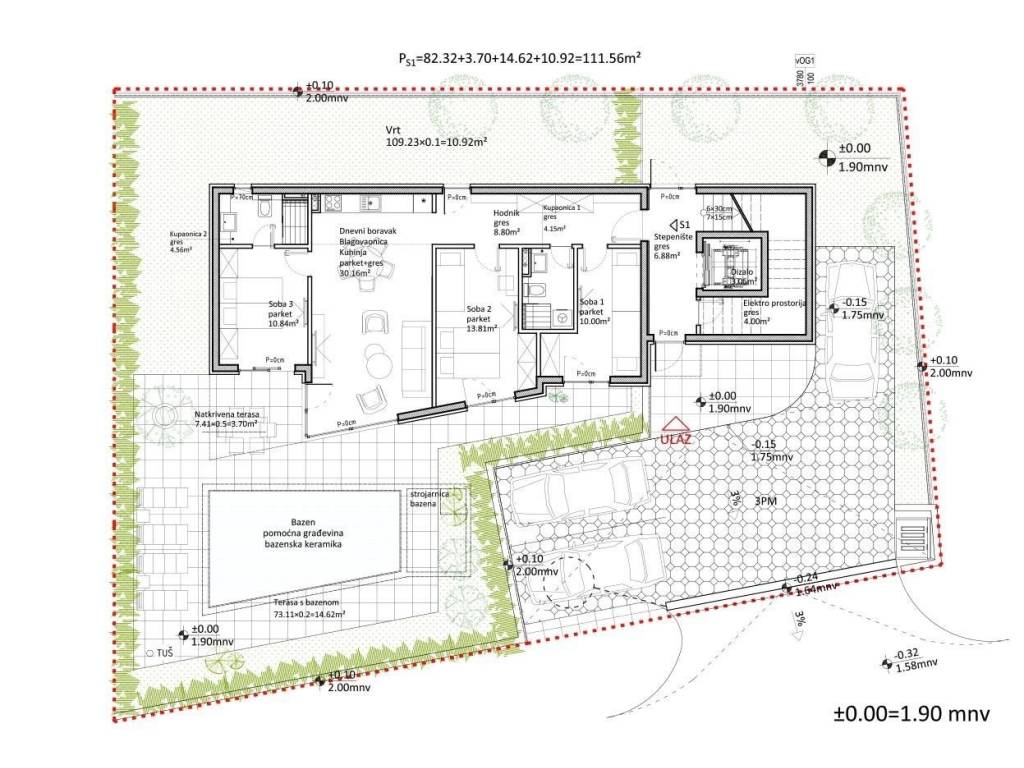 HODNIK : 12,78 m2 ULAZNI HOL : 8,11 m2 KUPAONICA 1 : 4,25 m2 KUPAONICA 2 : 5,57 m2 TOALET : 3,45 m2 VEŠERAJ : 2,73 m2 DNEVNI BORAVAK/KUHINJA/BLAGOVAONICA : 68,96 m2 MASTER SOBA : 18,06 m2 SPAVAĆA SOBA 1 : 11,65 m2 SPAVAĆA SOBA 2 : 13,59 m2 SPAVAĆA SOBA 3 : 12,36 m2 LOĐA : 25,76 m2 STEPENIŠTE : 12,40 m2 KROVNA TERASA : 197,45 m2 (brutto)