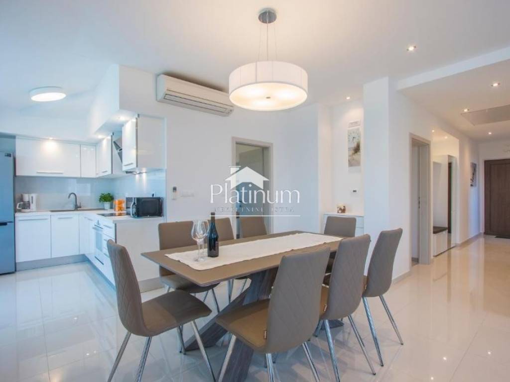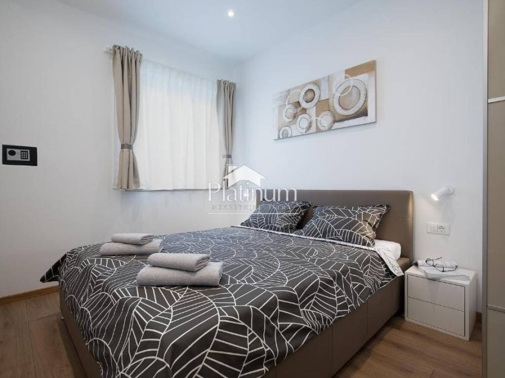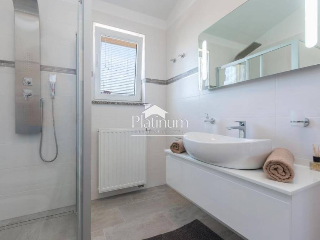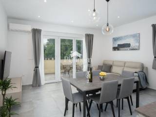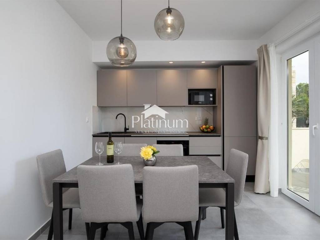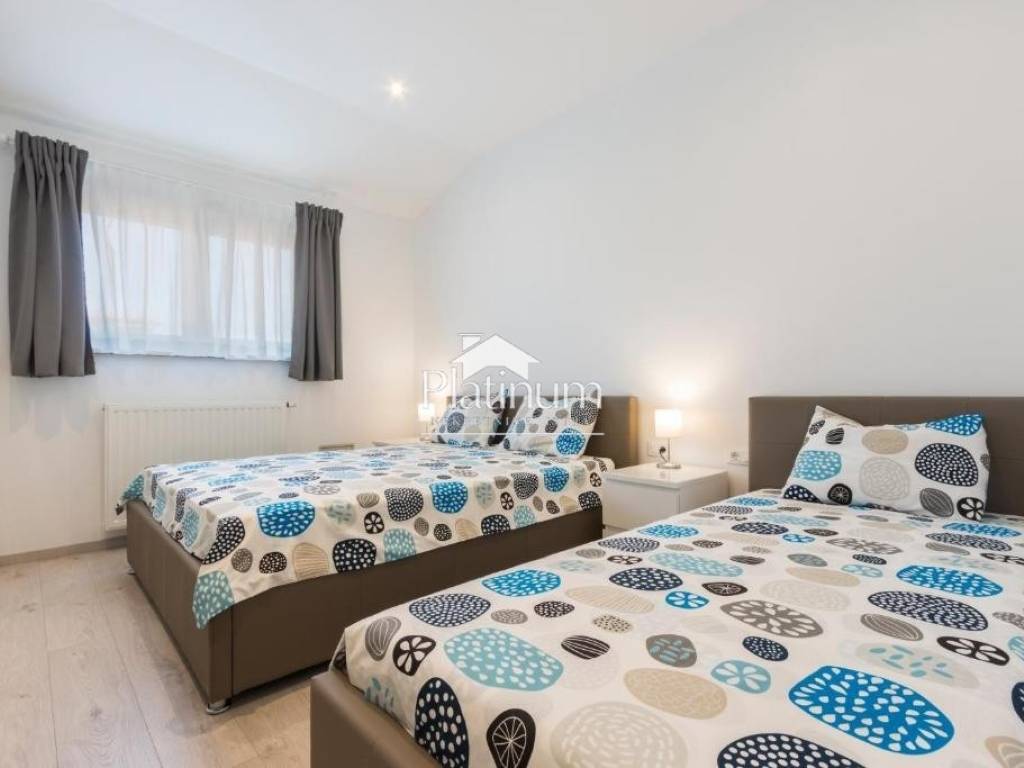 Prodaje se moderno namješten stan smješten na drugom katu manje zgrade ukupne površine 94,72 m. Stan odiše elegancijom, udobnošću i funkcionalnošću te je idealan izbor za obiteljski život ili kao investicija za turistički najam. Stan se sastoji od dvije prostrane i svijetle spavaće sobe, otvorenog koncepta dnevnog boravka, kuhinje i blagovaonice, dvije moderno uređene kupaonice, hodnika i velike natkrivene terase koja pruža ugodan prostor za opuštanje i druženje tijekom toplih mjeseci. Pripada mu i spremište u potkrovlju zgrade te vlastito parkirno mjesto na lijepo uređenoj i održavanoj okućnici. Zgrada je uredna, a okoliš miran što dodatno doprinosi kvaliteti boravka. Stan se nalazi u mirnom i tihom dijelu naselja, idealnom za one koji cijene privatnost i mir, a istodobno žele biti blizu svih sadržaja. More i plaža udaljeni su svega nekoliko minuta lagane šetnje, kao i trgovine, restorani, kafići i ostale svakodnevne potrebe.
