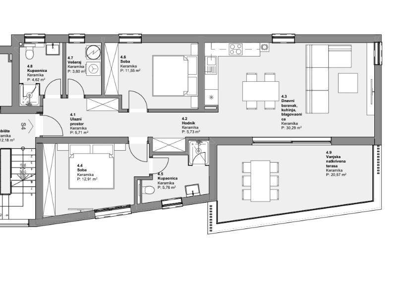 Stan ukupne površine 90m2 sastoji se od dnevnog boravka spojenog s kuhinjom i blagovaonicom u tzv. otvoreni koncept veličine 30,29m2, dvije spavaće sobe, dvije kupaonice s toaletom, praonice te natkrivene terase veličine 20m2.