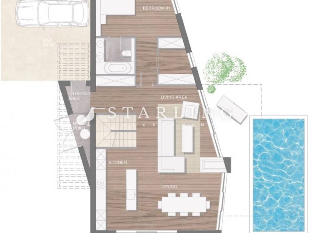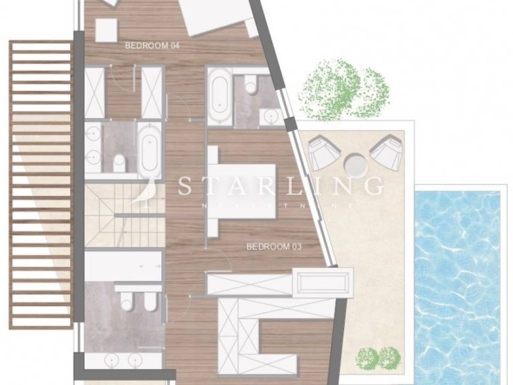 U mirnom naselju u blizini grada Labina, na prodaju je vila u roh bau fazi izgradnje površine 181 m2, s bazenom i okućnicom. Vila je dio prekrasnog 'Vineyard' naselja s ukupno 28 vila s bazenom, te dva teniska terena.
