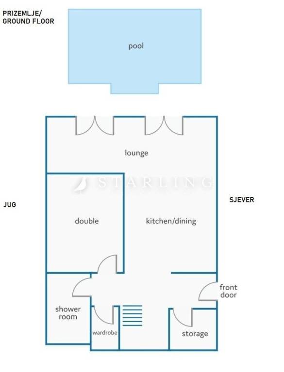 Prva etaža sastoji se od ulaznog prostora, open space kuhinje s otokom i blagovaonicom te dnevnog boravka, spavaće sobe, kupaonice, stepeništa i spremišta.