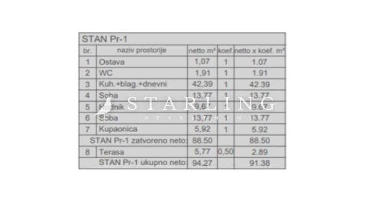 Stan se sastoji od dnevnog boravka s kuhinjom i blagovaonicom, dvije spavaće sobe, kupaonice, WC-a, ostave, hodnika te terase.