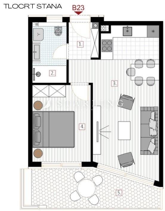 Stan se sastoji od ulaznog hodnika s garderobom, kupaonice. dnevnog boravka s kuhinjskim i blagovaonskim dijelom, spavaće sobe, te lođe.