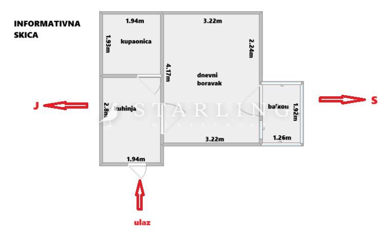Stan se sastoji od dnevnog boravka, kuhinje, kupaonice s wc-om, hodnika i balkona.