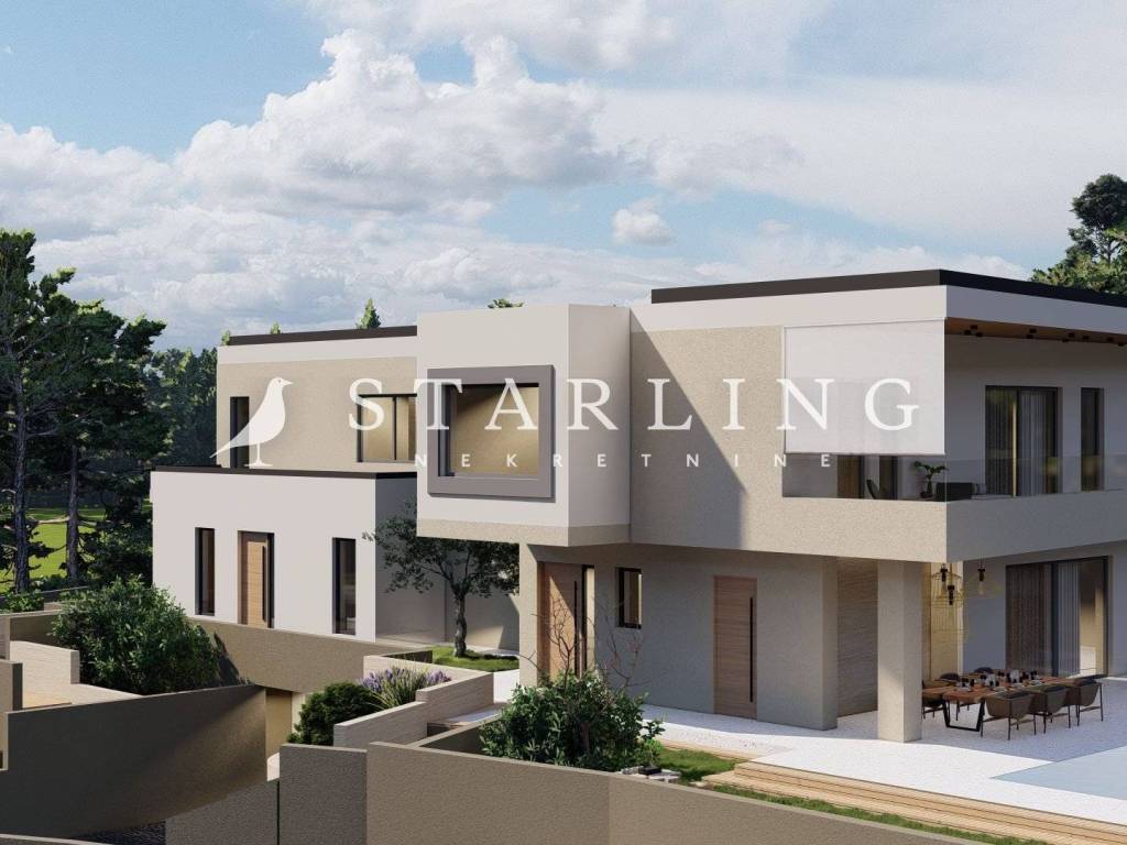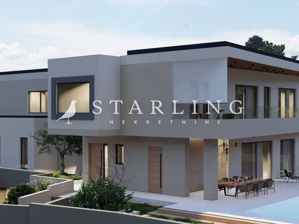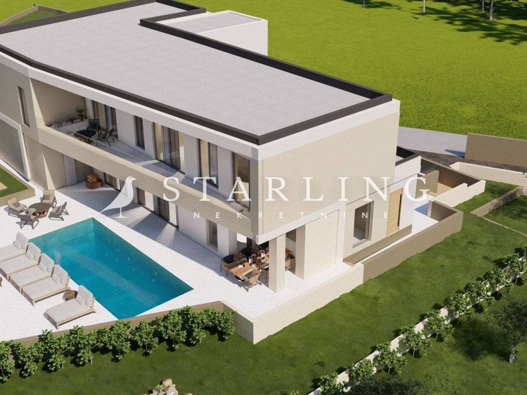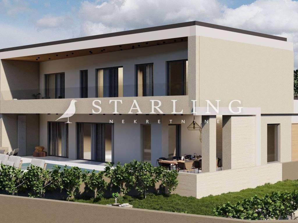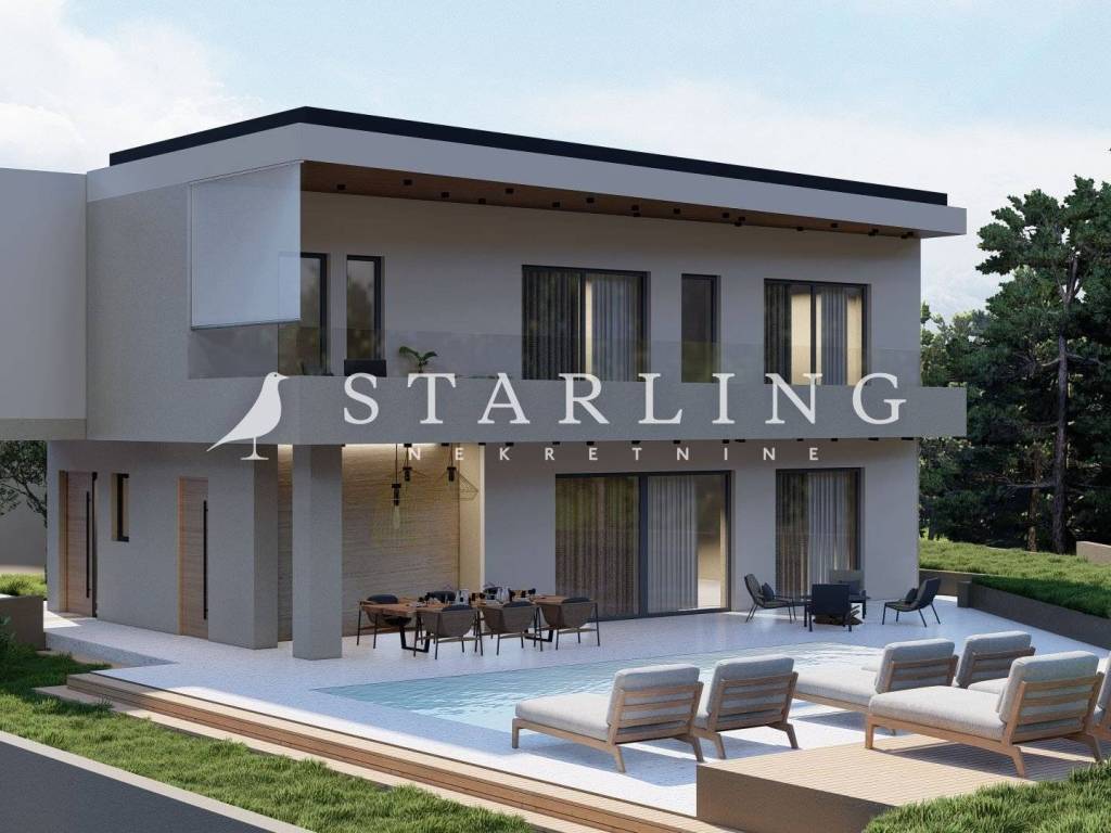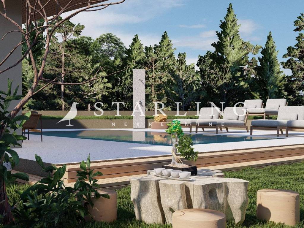 Profinjeno uređen okoliš dodatno krasi bazen, sunčalište i vanjska kuhinja uz natkriveni lounge dio.