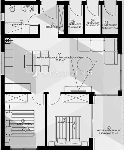 Stan se sastoji od prostranog dnevnog boravka, kuhinje i blagovaonice. Iz dnevnog boravka imamo direktan pristup prema natkrivenoj terasi. Stan ima dvije komforne spavaće sobe i kupaonicu. Posebnost ovog stana je prostrani vrt od 100 m2 koji pruža osjećaj komfora u kojem možete uživati s najbližima.