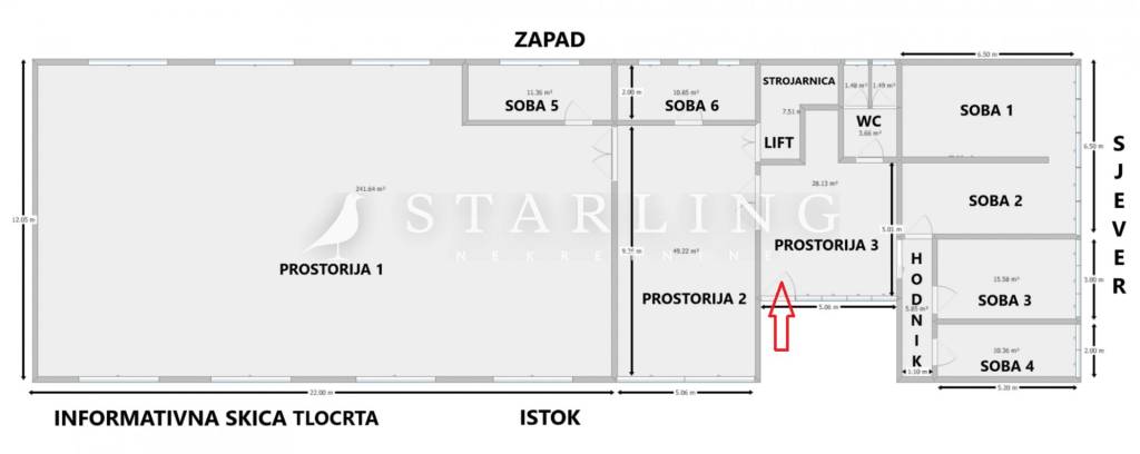 Sastoji se od tri prostorije, šest soba, sanitarnog čvora i hodnika.