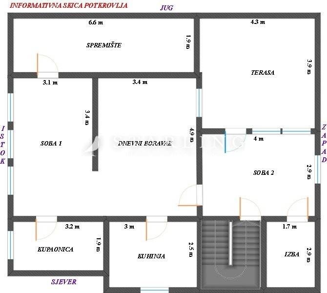 POTKROVLJE: dnevni boravak, kuhinja, dvije sobe, kupaonica, izba, spremište i terasa.