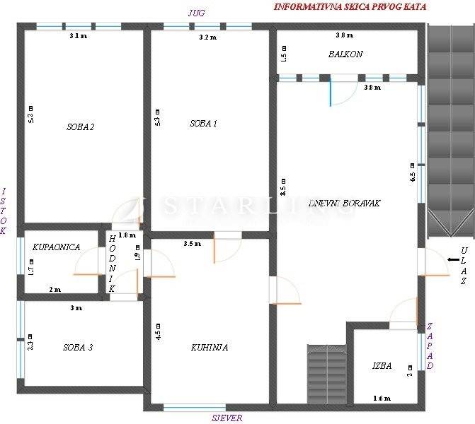 PRVI KAT: dnevni boravak, kuhinja, tri sobe, kupaonica, izba, hodnik te balkon.