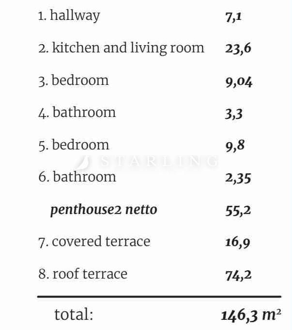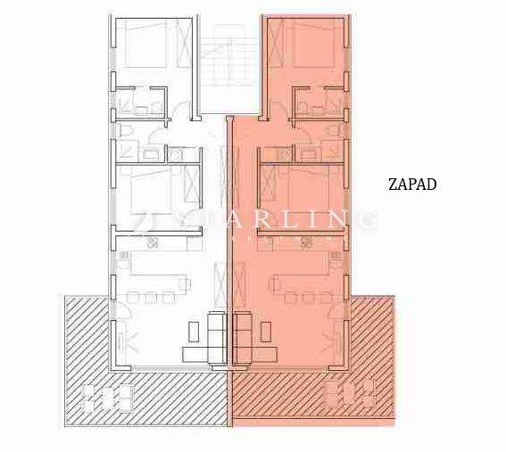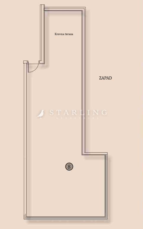 Stan se sastoji od dnevnog boravka s kuhinjom i blagovaonicom, dvije spavaće sobe, dvije kupaonice s wc-om i hodnika na jednoj etaži i krovne terase površine 91 m2 u drugoj etaži.