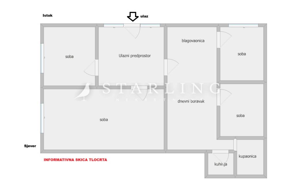 Stan se sastoji od dnevnog boravka, kuhinje s blagovaonicom, četiri spavaće sobe, kupaonice s WC-om, predprostora.