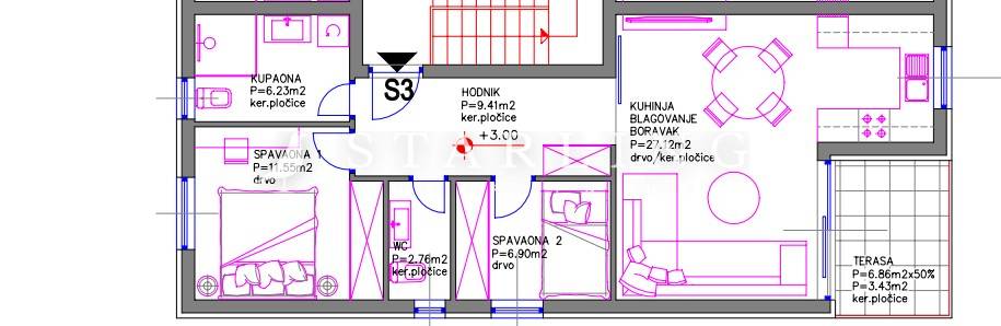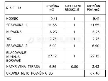 Stan se sastoji od ulaznog hodnika, otvorenog open space prostora koji se sastoji od gostinjskog toaleta, dnevnog boravka s kuhinjskim i blagovaonskim dijelom, dvije komforne spavaće sobe i kupaonice s walk-in tušem, te natkrivene terase. Posebnost ovog stana je prostrana terasa na kojoj možete u uživati s najbližima u zalasku sunca.