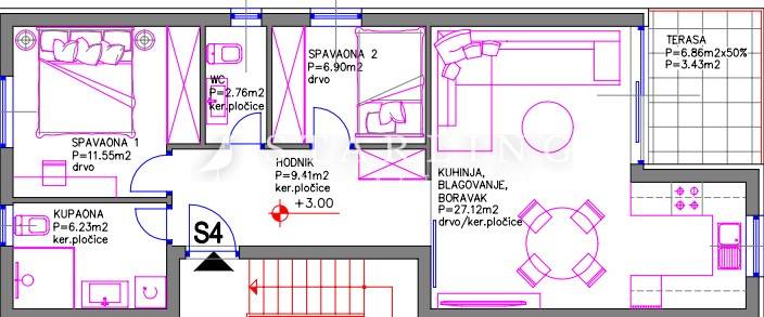 Stan se sastoji od ulaznog hodnika, otvorenog open space prostora koji se sastoji od gostinjskog toaleta, dnevnog boravka s kuhinjskim i blagovaonskim dijelom, dvije komforne spavaće sobe i kupaonice s walk-in tušem, te natkrivene terase. Posebnost ovog stana je prostrana terasa na kojoj možete u uživati s najbližima u zalasku sunca.