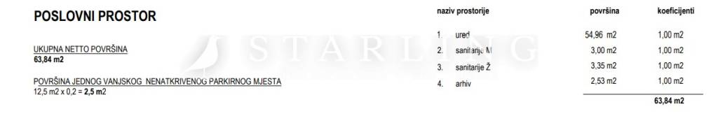 Prostor se sastoji ureda, spremišta te muškog i ženskog WC-a.