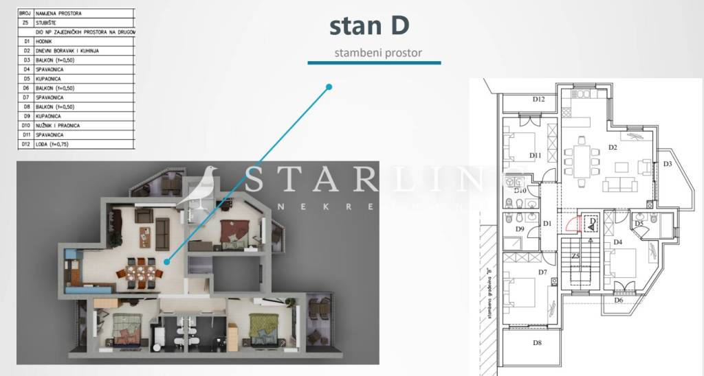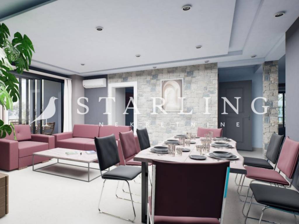 Stan se sastoji od ulaznog hodnika, otvorenog open space prostora koji se sastoji od dnevnog boravka s kuhinjskim i blagovaonskim dijelom, tri spavaće sobe i dvije komforne kupaonice s walk-in tuševima, gostinjski toalet te tri natkrivene terase.