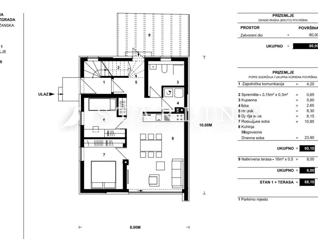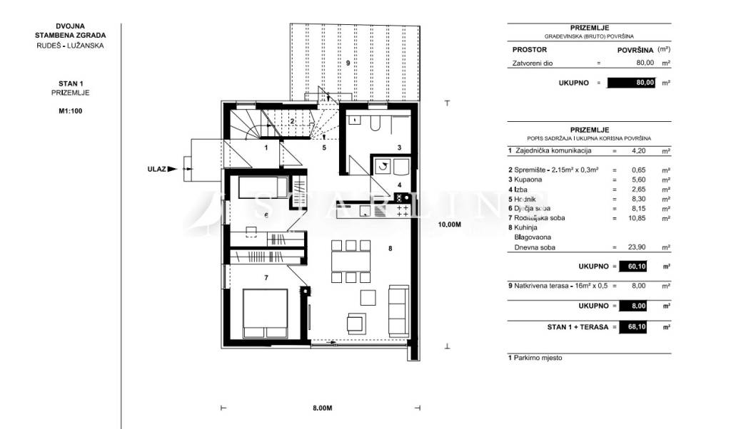 Prodaje se trosoban stan površine 72,60 m2 u prizemlju zgrade bez lifta. Zgrada ukupno ima 3 stana te se sastoji od prizemlja, prvog kata i uvučenog kata.