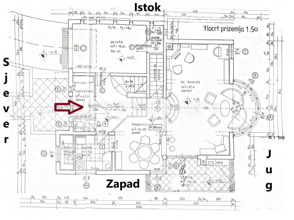 Prizemlje se sastoji od prostranog dnevnog boravka s blagovaonicom, kuhinje, ostave, ulaznog pretprostora, terase, toaleta i garaže.