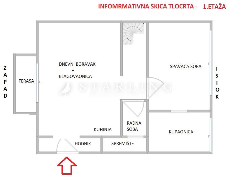 PRVE ETAŽE koja se sastoji dnevnog boravka s blagovaonicom i kuhinjom (koje imaju izlaz na terasu), spavaće sobe, radne sobe, spremišta, kupaonice s WC-om i jacuzzijem, stubišta i terase.