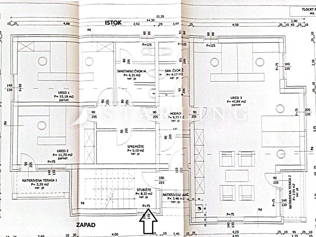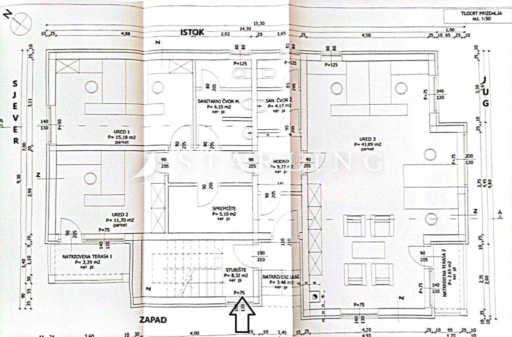 - PRIZEMLJA: tlocrtno pripada 3 ureda, 2 sanitarna čvora, spremišta, 2 natkrivene terase, stubišta i hodnika