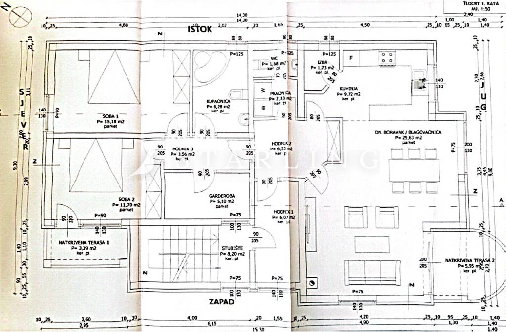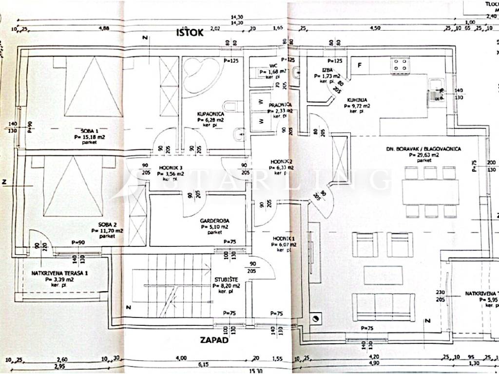 - PRVOG KATA : tlocrtno pripada dnevni boravak s blagovaonicom, kuhinja, 2 spavaće sobe, kupaonica, WC, praonica, 2 natkrivene terase, garderoba, stubište i hodnik.