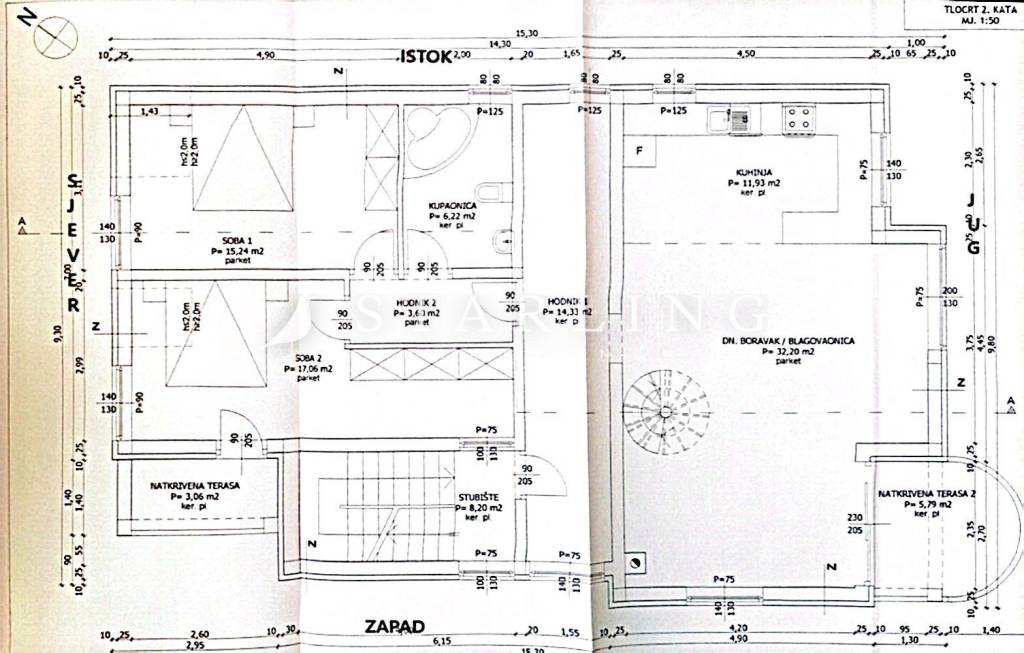- DRUGOG KATA: tlocrtno pripada dnevni boravak s blagovaonicom, kuhinja, 2 spavaće sobe, 2 natkrivene terase, 2 hodnika i stubište.