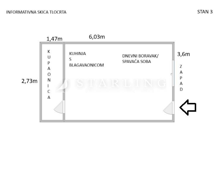 Stan se sastoji od tri garsonijere s odvojenim ulazom. Svaka garsonijera se sastoji od dnevnog boravka/spavaće sobe, kuhinje s blagovaonicom i kupaonice.
