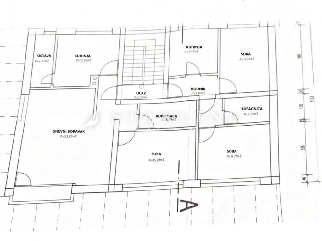 Na prvom katu nalazi se stan koji se sastoji od dnevnog boravka s blagovaonicom, kuhinje, dvije spavaće sobe, kupaonice i hodnika.