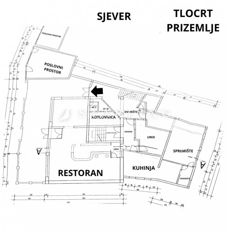 U prizemlju kuće smješten je lokal koji trenutno posluje kao cafe bar, površine oko 105 m2. Lokal ima pripadajuću natkrivenu terasu površine oko 50 m2, a dodatno je opremljen novom kuhinjom koja omogućuje otvaranje restorana. Uz to, prostor uključuje i skladišne i uredske prostorije.