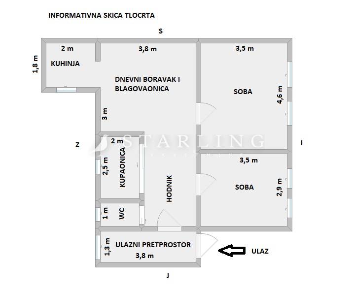 Stan se sastoji od dnevnog boravka i blagovaonice, kuhinje, dvije spavaće sobe, kupaonice s wc-om, odvojenog wc-a, hodnika i ulaznog pretprostora.