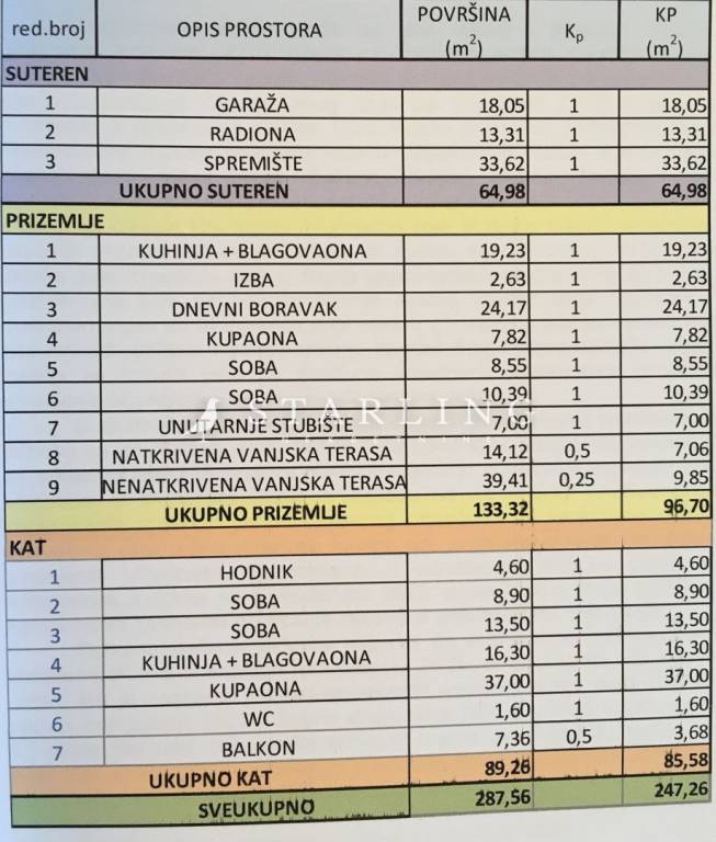 Kuća se sastoji od tri etaže, u suterenu se nalazi garaža opremljena vodom, radiona i spremište.