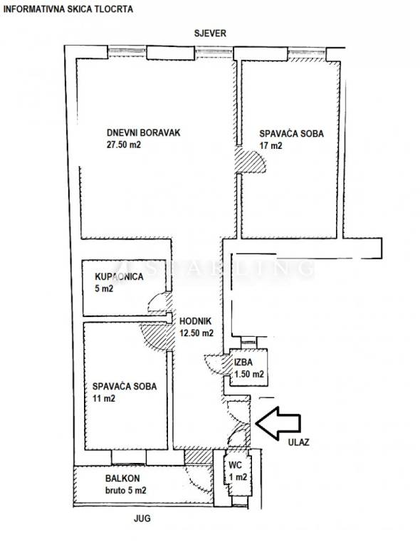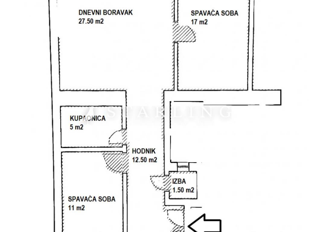 Prodaje se trosoban stan ukupne neto površine 77 m2 na drugom katu zgrade bez lifta.
