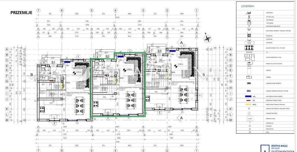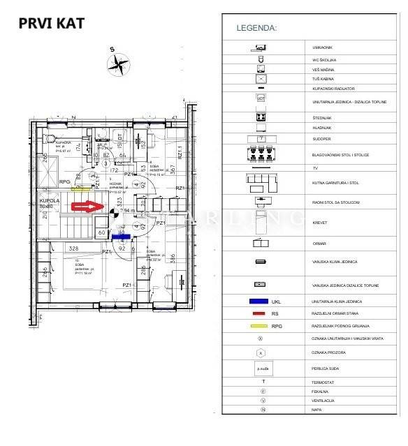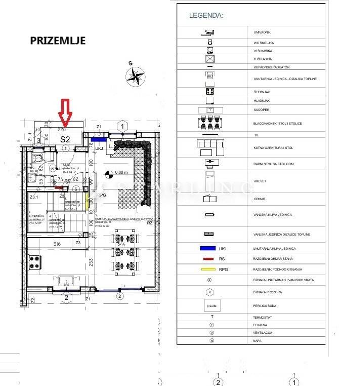 - PRIZEMLJA: dnevni boravak s kuhinjom i blagovaonicom, spremišta, wc-a, ulaznog hodnika te terasa