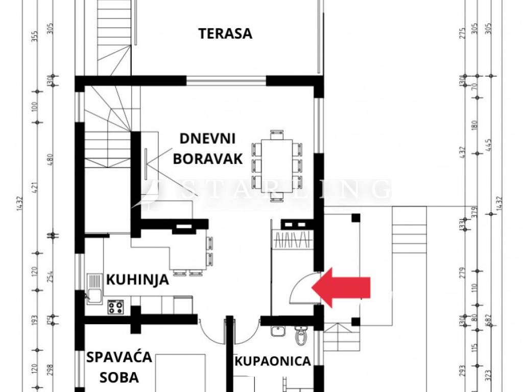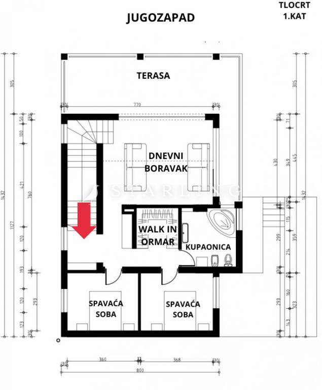 Kat se sastoji od: dnevnog boravka, dvije spavaće sobe, kupaonice s wc-om, walk-in ormara, hodnika i terase.