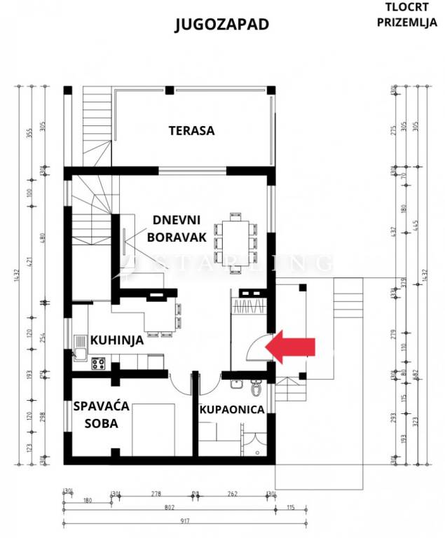 Prizemlje se sastoji od: dnevnog boravka s blagovaonicom, kuhinje, spavaće sobe, kupaonice s wc-om, hodnika i terase.