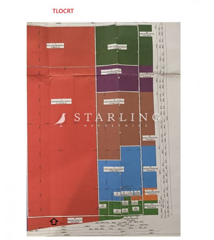 Prodaje se poslovna hala površine 1687 m2 (na tlocrtu označeno crvenom bojom), u Opuzenu. Uz halu se prodaju i 4 uredska prostora od 86 m2 (na tlocrtu označeno zelenom bojom).