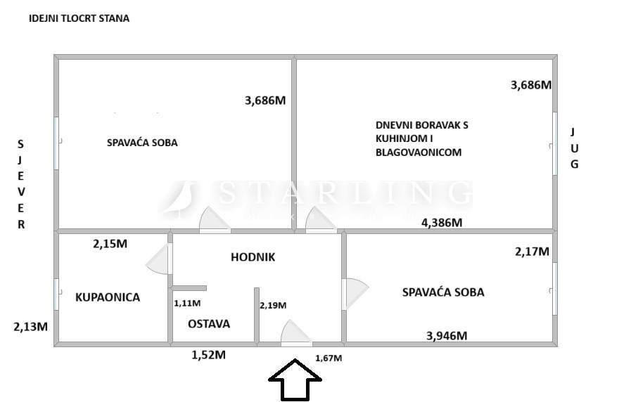 Stan se sastoji od dnevnog boravka s kuhinjom, dvije spavaće sobe, kupaonice s wc-om, ostave i ulaznog hodnika.